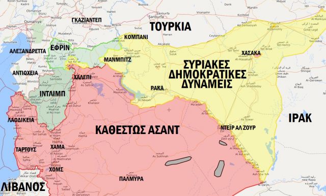 Στις αποχρώσεις του πράσινου τα εδάφη που τελούν υπό τουρκική κατοχή και τουρκικό έλεγχο στη βορειοδυτική Συρία. Στην Ιντλίμπ ισχυρότερη οργάνωση είναι η συριακή Αλ Κάιντα, η Ταχρίρ Αλ Σαμ.