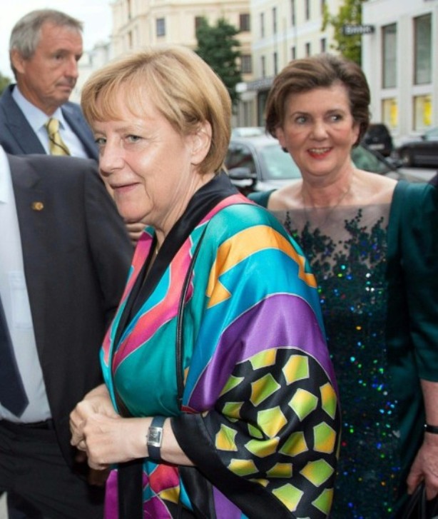 Το στιγμιότυπο είναι από εμφάνισή της σε κονσέρτο πιάνου την Κυριακή στο Σάλτσμπουργκ, όπου η Άνγκελα Μέρκελ επέλεξε μία σατέν εμπριμέ πουκαμίσα, τύπου κιμονό.