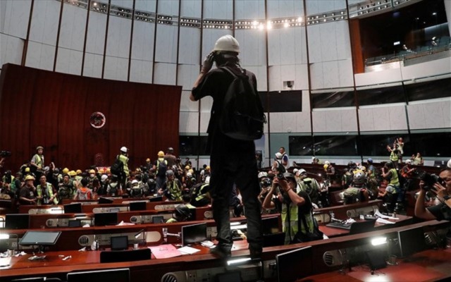 Δεκάδες άνθρωποι, με καλυμμένα τα πρόσωπά τους, πολλοί εκ των οποίων κρατώντας αυτοσχέδιες ασπίδες, διείσδυσαν στο Νομοθετικό Συμβούλιο (LegCo), καταφέρνοντας να μπουν έπειτα από προσπάθειες ωρών, μεταδίδει το τηλεοπτικό δίκτυο i-Cable News.