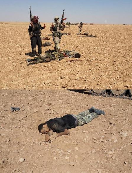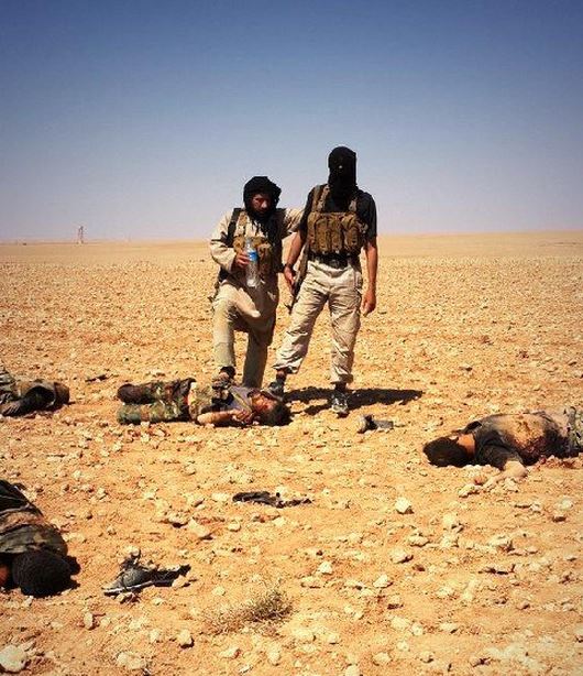 Νέες φρικιαστικές φωτογραφίες ανέβασαν στο διαδίκτυο οι τζιχαντιστές της οργάνωσης Ισλαμικό Κράτος που κατέλαβαν αεροπορική βάση της Συρίας στην πόλη Αλ Ράκα.