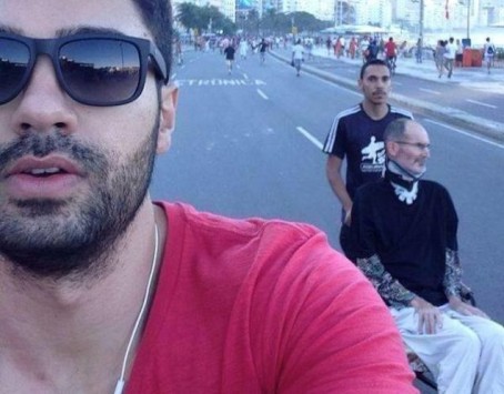 Στη φωτογραφία φαίνεται ο άνδρας που τραβά τη selfie και πίσω του ένας νεαρός που σπρώχνει ένα αναπηρικό καροτσάκι στο οποίο κάθεται ένας άνδρας που ομολογουμένως μοιάζει με τον Στηβ Τζομπς.