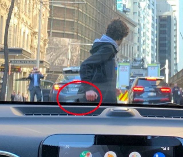 Εικόνες που μεταδόθηκαν από τα αυστραλιανά μέσα ενημέρωσης δείχνουν τον άνδρα να πηδάει πάνω στην οροφή ενός αυτοκινήτου φωνάζοντας Αλλαχού Ακμπάρ (Ο Θεός είναι ο Ύψιστος) και να κραδαίνει ένα μαχαίρι φωνάζοντας «Σκοτώστε με!».
