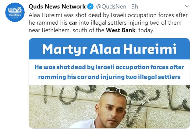 Ο Παλαιστίνιος τρομοκράτης είναι ο Αλάα Χουρεΐμι (Alaa Hureimi), τον οποίο ισλαμικές ιστοσελίδες επαινούν ως «μάρτυρα», όπως μπορείτε να δείτε και σε ανάρτηση που ακολουθεί: