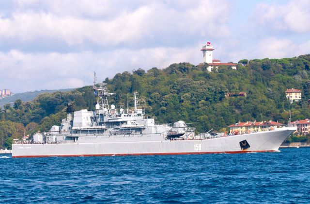 Το συγκεκριμένο πλοίο, από το πέρασμα του οποίου αναδημοσιεύουμε φωτογραφίες, ανήκει στον ρωσικό αποβατικό στόλο της Μαύρης Θάλασσας.