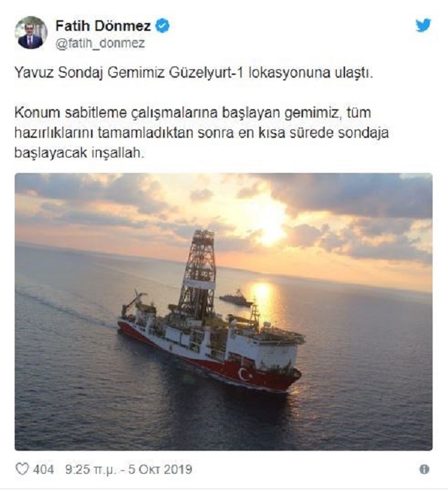 Σε ανάρτηση του στον προσωπικό του λογαριασμό στο Twitter ο Ντονμέζ σημείωσε ότι το τουρκικό γεωτρύπανο έφτασε στον στόχο «Μόρφου – 1» και ετοιμάζεται να εγκατασταθεί.
