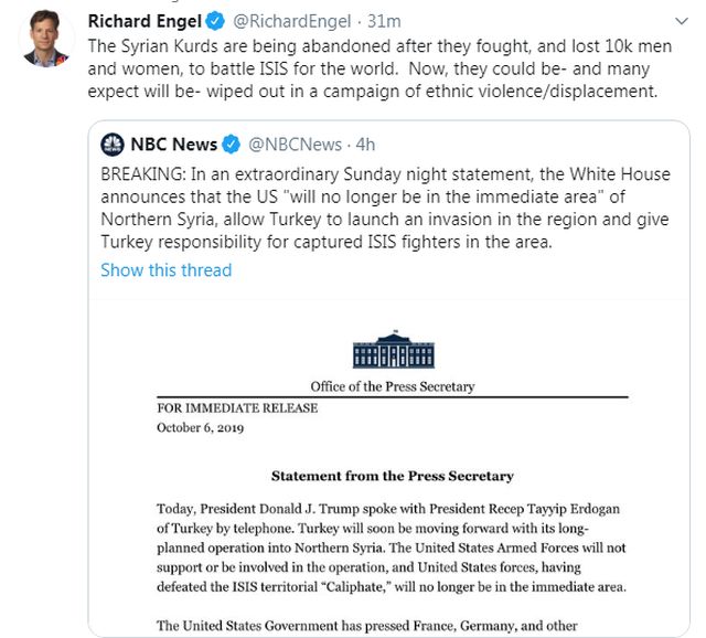 Ο Ρίτσαρντ Έιντζελ, επικεφαλής συντάκτης των διεθνών στο αμερικανικό τηλεοπτικό δίκτυο NBC, κατακρίνει με δριμύτητα την απόφαση του Ντόναλντ Τραμπ να εγκαταλείψει τους Κούρδους στις ισλαμιστικές ορδές του Ερντογάν.