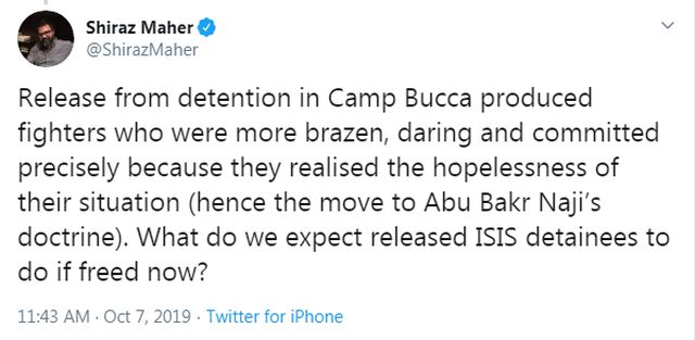 Σε δεύτερη ανάρτησή του υπενθύμισε ότι η απελευθέρωση τζιχαντιστών από τη φυλακή «Καμπ Μπούκα», που είχαν δημιουργήσει οι Αμερικανοί στο Ιράκ, παρήγαγε τζιχαντιστές πιο αλαζονικούς, τολμηρούς και αφοσιωμένους «επειδή ακριβώς συνειδητοποίησαν την απελπιστική κατάστασή τους» προσχωρώντας στις απόψεις του Άμπου Μπακρ Νατζί, ηγέτη της ιρακινής Αλ Κάιντα που εισηγήθηκε τη δημιουργία του «χαλιφάτου».