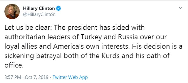 Με σκληρό τρόπο σχολίασε η Χίλαρι Κλίντον την απόφαση του Αμερικανού προέδρου να δώσει «πράσινο φως» στην Τουρκία για παράνομη στρατιωτική επιχείριση κατά των Κούρδων στη βόρεια και ανατολική Συρία.