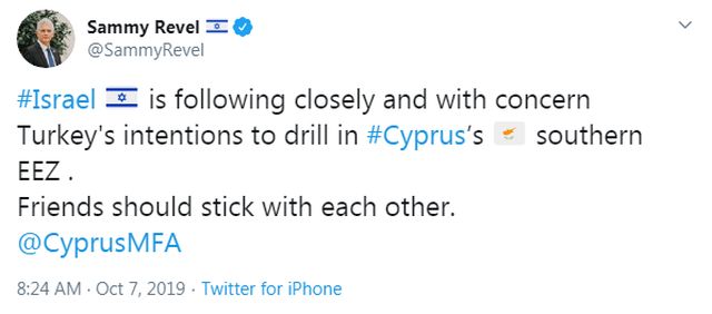 Σε ανάρτησή του στο Twitter ο Ισραηλινός πρεσβευτής στη Λευκωσία, Σάμι Ρέβελ, γράφει ότι το Ισραήλ παρακολουθεί από κοντά και με ανησυχία της τουρκικές προθέσεις για γεώτρηση στη νότια ΑΟΖ της Κύπρου.