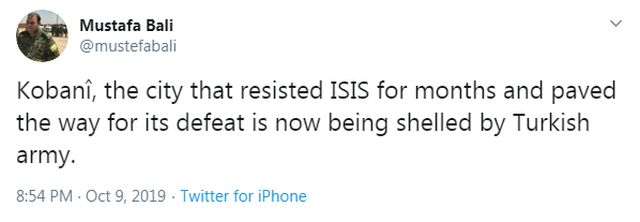 Την Τετάρτη 9 Οκτωβρίου το βράδυ, πρώτη ημέρα της τουρκικής επίθεσης στις υπό κουρδική διοίκηση Συριακές Δημοκρατικές Δυνάμεις (SDF), η Τουρκία βομβάρδισε την Κομπάνι για να πάρει πίσω το αίμα των εκατοντάδων Τούρκων τζιχαντιστών και πρακτόρων της MIT που σκοτώθηκαν στην πολιορκία πολεμώντας μέσα από τις γραμμές του Ισλαμικού Κράτους.