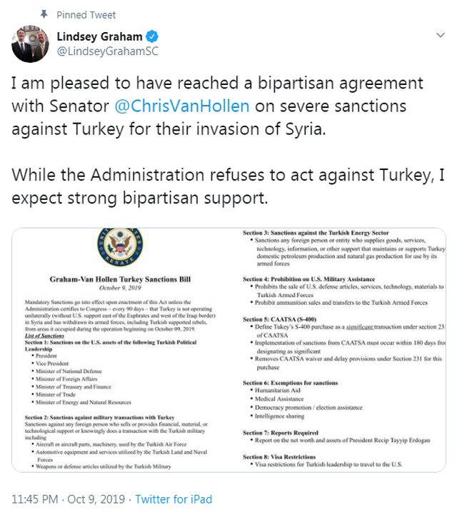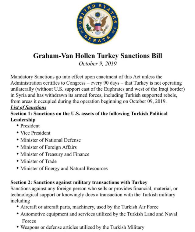 Το δικομματικό νομοσχέδιο με τις κυρώσεις στην Τουρκία, για την εισβολή στο συριακό Κουρδιστάν, των γερουσιαστών Λίντσεϊ Γκράχαμ (Ρεπουμπλικανός) και Κρις Βαν Χόλεν (Δημοκρατικός) δόθηκε στη δημοσιότητα.