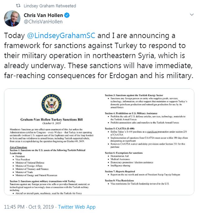 Οι Βαν Χόλεν και Γκράχαμ συνδέουν την άρση των κυρώσεων αυτών με την απόσυρση των τουρκικών στρατευμάτων από τη Συρία, όπου άρχισαν την Τετάρτη επιχειρήσεις εναντίον των Κούρδων.