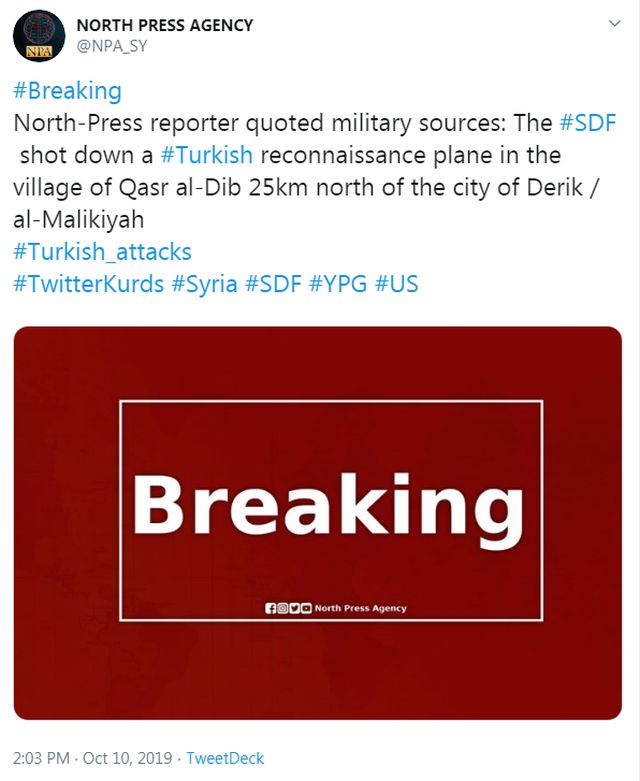 Οι υπό κουρδική διοίκηση Συριακές Δημοκρατικές Δυνάμεις (SDF) μεταδίδεται ότι κατέρριψαν ένα τουρκικό αναγνωριστικό αεροσκάφος.
