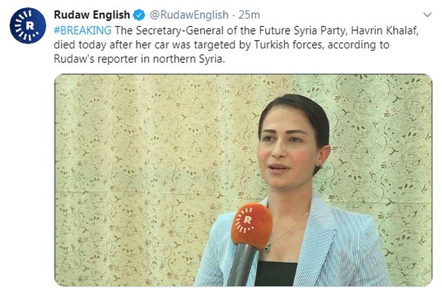 Η γενική γραμματέας του κόμματος «Μελλοντική Συρία», Χαβρίν Χαλάφ (Havrin Khalaf), σκοτώθηκε το Σάββατο όταν το αυτοκίνητο που επέβαινε χτυπήθηκε από τον τουρκικό στρατό, μεταδίδει ο πολεμικός ανταποκριτής του κουρδικού δικτύου Rudaw στη βόρεια Συρία.