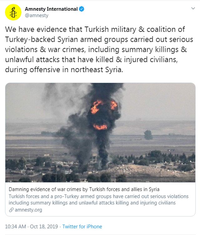 Υπενθυμίζεται ότι την Παρασκευή, η Διεθνής Αμνηστία υποστήριξε ότι έγιναν εγκλήματα πολέμου από την Τουρκία στη Συρία.