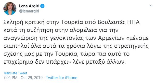 «Σκληρή κριτική στην Τουρκία από Βουλευτές ΗΠΑ κατά τη συζήτηση στην ολομέλεια για την αναγνώριση της γενοκτονίας των Αρμενίων «μέναμε σιωπηλοί όλα αυτά τα χρόνια λόγω της στρατηγικής σχέσης μας με την Τουρκία, τώρα πια αυτό το επιχείρημα δεν υπάρχει» λένε μεταξύ άλλων».