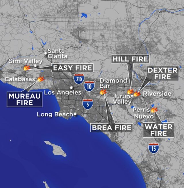 Με το όνομα Easy Fire, η φωτιά ξέσπασε τα ξημερώματα στην κοιλάδα Σίμι, βορειοδυτικά της αμερικανικής μεγαλούπολης, προτού εξαπλωθεί ραγδαία μέσα στην ημέρα.
