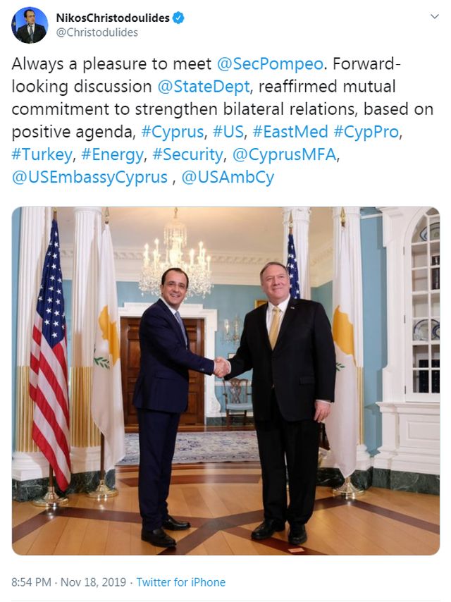 Ο κ. Πομπέο ενημέρωσε τον Κύπριο ομόλογό του και για τις συνομιλίες που είχε την περασμένη εβδομάδα στην Ουάσιγκτον, με τον Τούρκο υπουργό Εξωτερικών, Μεβλούτ Τσαβούσογλου, στο πλαίσιο της επίσκεψης Ερντογάν.