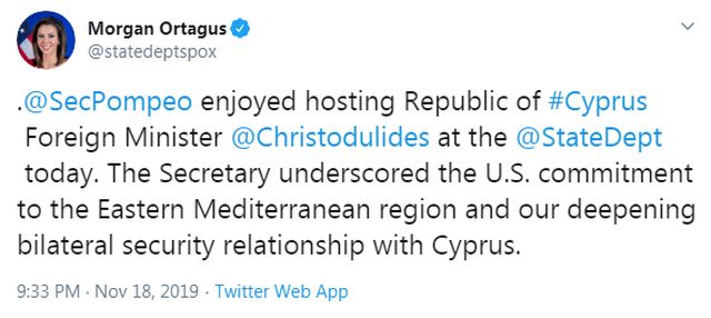 O ίδιος αξιωματούχος ανέφερε ακόμη πως ο Μάικ Πομπέο «επιβεβαίωσε τη μακρόχρονη αμερικανική πολιτική για το δικαίωμα της Κυπριακής Δημοκρατίας να αναπτύσσει φυσικούς πόρους στην Αποκλειστική Οικονομική Ζώνη της και τη συνεχιζόμενη στήριξη των ΗΠΑ στις κυπριακής ηγεσίας προσπάθειες υπό τη διευκόλυνση των Ηνωμένων Εθνών, για επανένωση της νήσου ως διζωνική δικοινοτική ομοσπονδία, προς όφελος όλων των Κυπρίων».