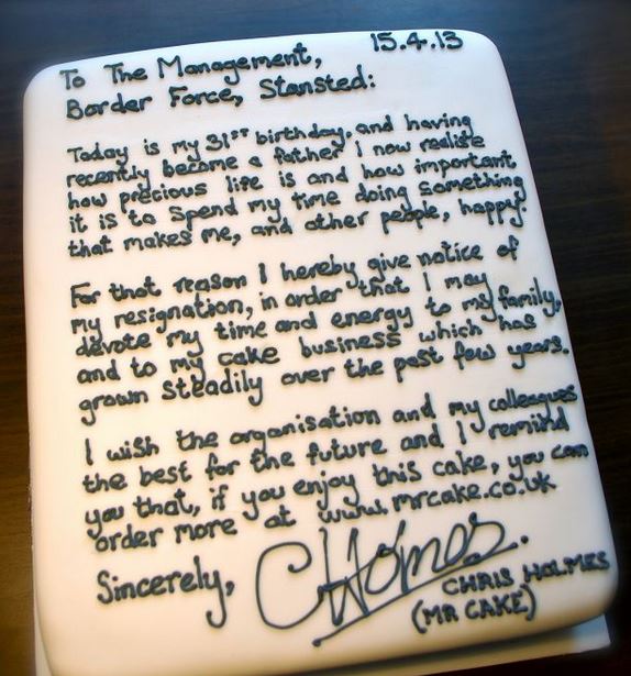 Έγραψε την επιστολή παραίτησης πάνω σε μια τούρτα που είχε φτιάξει ο ίδιος και αυτό γιατί ήθελε να σταματήσει να εργάζεται στο αεροδρόμιο Stansted και να ανοίξει ένα ζαχαροπλαστείο.