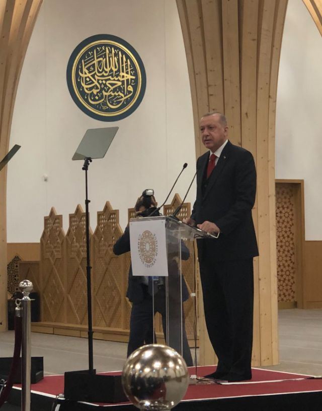 Ο Ερντογάν στην ομιλία του στα εγκαίνια του τζαμιού στο Κέμπριτζ. Στη φωτογραφία κάτω, το εντυπωσιακό τζαμί.