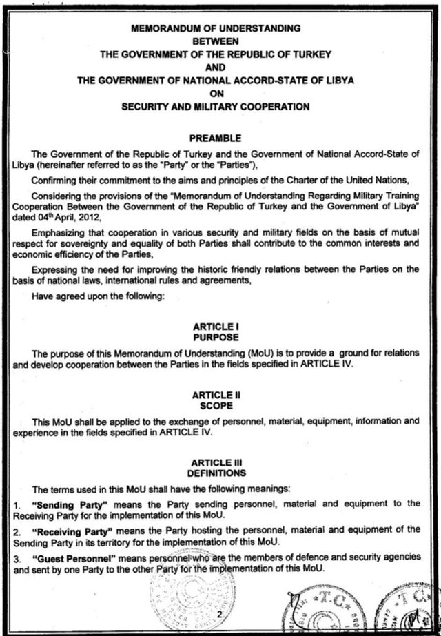 Τον περασμένο μήνα, η κυβέρνηση του Φάγεζ αλ Σαράτζ, που έχει την έδρα της στην Τρίπολη, υπέγραψε με την Τουρκία μια διευρυμένη «συμφωνία» για στρατιωτικά ζητήματα και ζητήματα ασφαλείας καθώς και ένα «μνημόνιο» για τα θαλάσσια σύνορα.