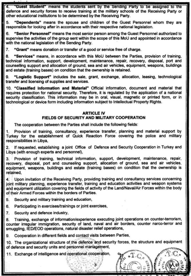 Επίσης προσφέρει, μεταξύ άλλων, τουρκική υποστήριξη για την εγκαθίδρυση μιας μονάδας άμεσης επέμβασης στην αστυνομία και τον «στρατό» στην Τρίπολη, καθώς και ενισχυμένη συνεργασία στις πληροφορίες μυστικών υπηρεσιών και στην αμυντική βιομηχανία.