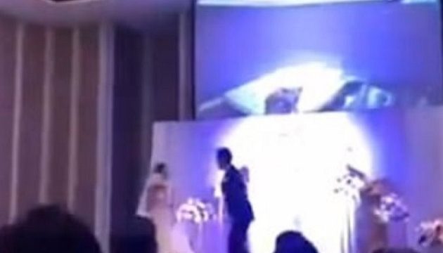 Στα βίντεο που έχουν κυκλοφορήσει στα social media, φαίνεται ένα ζευγάρι νεόνυμφων να μπαίνει σε μία αίθουσα εκδηλώσεων και να γίνεται δεκτό με χειροκροτήματα από συγγενείς και φίλους.
