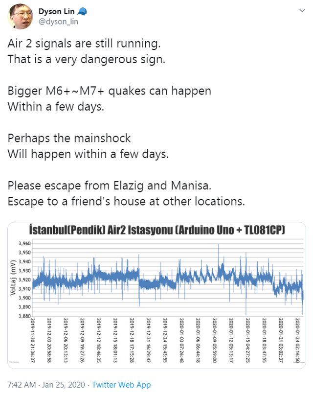 Όπως εξηγεί, ίσως ο σεισμός που συνέβη χθες να μην ήταν ο κύριος, και κάνει έκκληση στους κατοίκους της Ελαζίγ και της Μανίσα, να εγκαταλείψουν τις περιοχές και να πάνε σε άλλες κοντινές περιοχές ή στην Κωνσταντινούπολη.