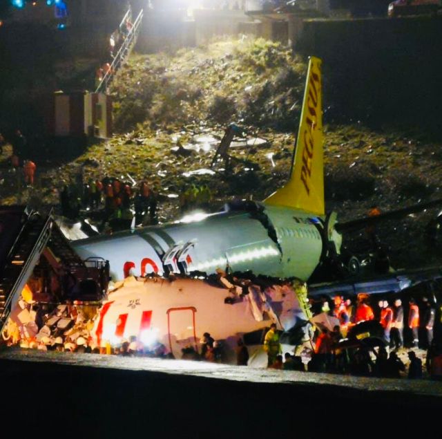 Η άτρακτος του αεροσκάφους Boeing 737 της ιδιωτικής τουρκικής αεροπορικής εταιρείας χαμηλού κόστους Pegasus κόπηκε στα τρία και πήρε φωτιά, σύμφωνα με εικόνες που μεταδόθηκαν από το τηλεοπτικό δίκτυο CNN-Türk.