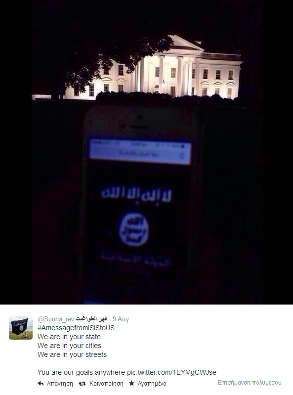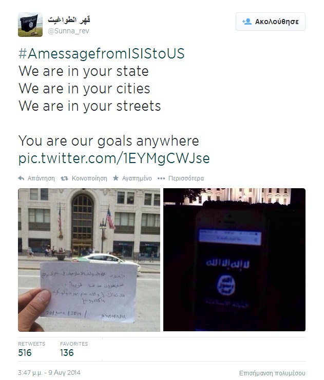 Μέχρι στιγμής καμία επίσημη Αρχή στις ΗΠΑ δεν έχει σχολιάσει τα tweet που βλέπετε. Ωστόσο, το μήνυμα που θέλει να στείλει το Ισλαμικό Κράτος είναι ξεκάθαρο. Βρισκόμαστε μέσα στις ΗΠΑ, είμαστε μια ανάσα από τον Λευκό Οίκο και είμαστε αποφασισμένοι να φέρουμε τον πόλεμο μέσα στις πόλεις σας…