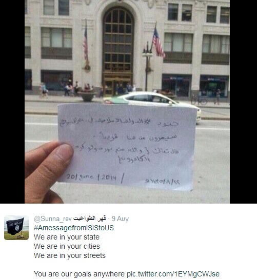 Συναγερμός έχει σημάνει στις ΗΠΑ από δύο tweet, με ημερομηνία 9 Αυγούστου, τα οποία αναρτήθηκαν με το hashtag #AMessagefromISIStoUS (είναι το hashtag που χρησιμοποιούν οι τζιχαντιστές για να απειλούν τις ΗΠΑ), όπου στο πρώτο κάποιος -τζιχαντιστής- κρατά ένα κομμάτι χαρτί με αραβική γραφή μπροστά στο μέγαρο της Ολντ Ριπάμπλικ (Old Republic Building) στο Σικάγο και στο δεύτερο ένας άλλος τζιχαντιστής τραβά φωτογραφία τον Λευκό Οίκο στην Ουάσιγκτον.