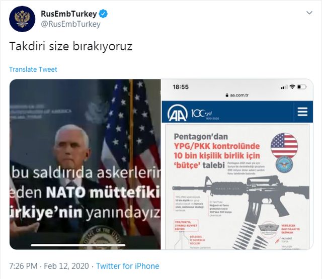 Η πρώτη περιλάμβανε φωτογραφία του Αμερικανού υπουργού Εξωτερικών Μάικ Πομπέο και της δήλωσής του αναφορικά με τον θάνατο Τούρκων στρατευσίμων στη διάρκεια επίθεσης στην Ιντλίμπ: