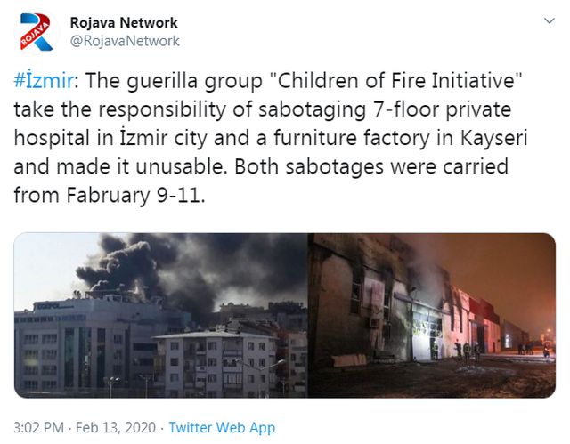 Η κουρδική ομάδα «ανταρτών πόλης» με την ονομασία «Πρωτοβουλία Τέκνων του Πυρός» ανέλαβαν την ευθύνη για τον εμπρησμό επταώροφου ιδιωτικού νοσοκομείου στη Σμύρνη και ενός εργοστασίου κατασκευής επίπλων στην Καισάρεια. Τα σαμποτάζ πραγματοποιήθηκαν από τις 9 έως 11 Φεβρουαρίου.