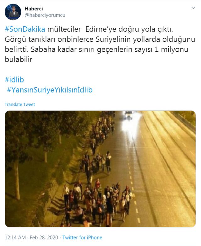 Σύμφωνα με τουρκικό ειδησεογραφικό πρακτορείο Demiroren περίπου 300 άτομα, μεταξύ των οποίων γυναίκες και παιδιά, κατευθύνονταν κατά τη διάρκεια της νύχτας μέσω της επαρχίας της Αδριανούπολης στη συνοριακή γραμμή του Έβρου, μετά τη χθεσινή δήλωση Τούρκων αξιωματούχων ότι η Άγκυρα δεν θα σταματά τους πρόσφυγες και μετανάστες που θα επιδιώξουν να φτάσουν στην Ευρώπη από ξηράς ή θαλάσσης, στον απόηχο των βομβαρδισμών στο Ιντλίμπ που έχουν κοστίσει τη ζωή σε πάνω από 30 Τούρκους στρατιώτες.
