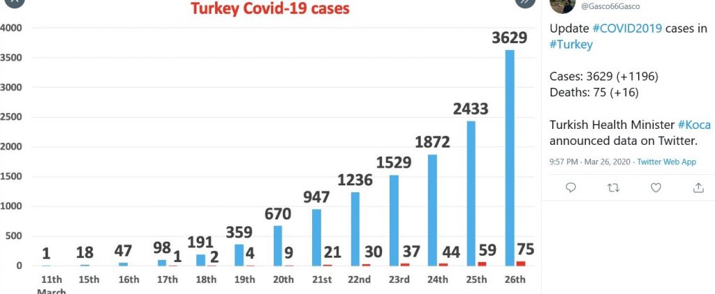 Συγκεκριμένα, το βράδυ της Πέμπτης ο Τούρκος υπουργός Υγείας, Φαχρετίν Κοτζά ανακοίνωσε ότι η χώρα μετρά, πλέον, 75 νεκρούς και 3.629 κρούσματα καλώντας μέσω social media τους συμπατριώτες του να εφαρμόσουν τα μέτρα.