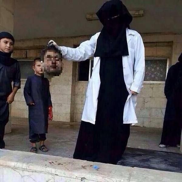 Η φωτογραφία μιας γυναίκας να κρατά υπερήφανη ένα κεφάλι και να ποζάρει κάνει το γύρο του διαδικτύου. Το πιο απεχθές είναι, ότι η γυναίκα φορά πάνω από τον ισλαμικό παραδοσιακό μανδύα της ιατρική στολή που σημαίνει ότι είναι ή γιατρός ή νοσοκόμα…