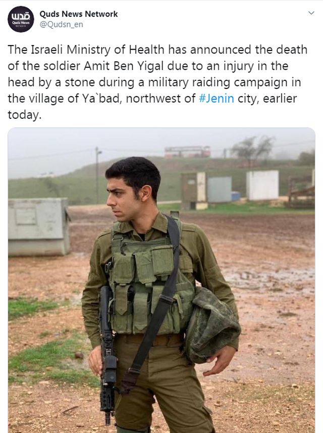 Ο λοχίας Αμίτ Μπεν Ιγκάλ, 21 ετών, επλήγη στο κεφάλι «σήμερα το πρωί, στη διάρκεια επιχείρησης κοντά στο χωριό Γιαμπάντ, δυτικά της Τζενίν», επεσήμανε ο στρατός στην ανακοίνωσή του.