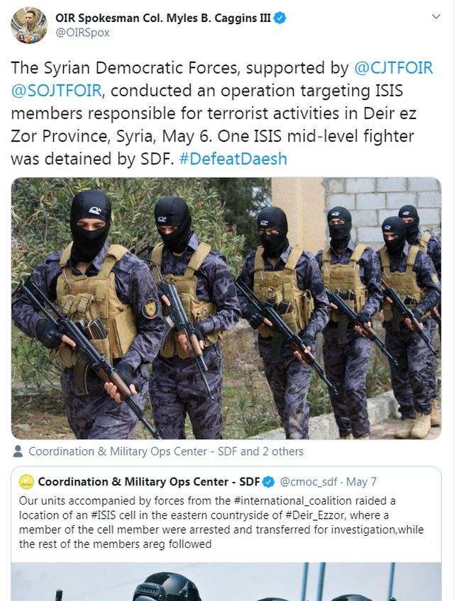 Ο εκπρόσωπος του Διεθνούς Συνασπισμού, Μάιλς Κάγκινς, σε ανάρτησή του στο Twitter είχε ανακοινώσει την περασμένη εβδομάδα ότι στις 6 Μαΐου πραγματοποιήθηκε συνδυασμένη επιχείριση ενάντια στο Ισλαμικό Κράτος στη Ντέιρ αλ Ζουρ με στόχο τζιχαντιστές του ISIS που ήταν υπεύθυνοι για τρομοκρατικές ενέργειες στην περιοχή και ένα μεσαίο στέλεχος της οργάνωσης συνελήφθη.