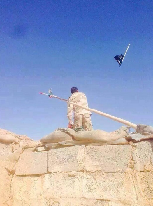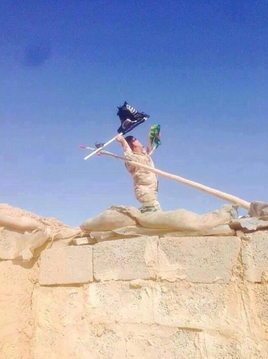 Πρώτη του δουλειά να αρπάξει τη σημαία του Ισλαμικού Κράτους, που κυμάτιζε σε αυτή τη θέση και να την πετάξει μακριά…