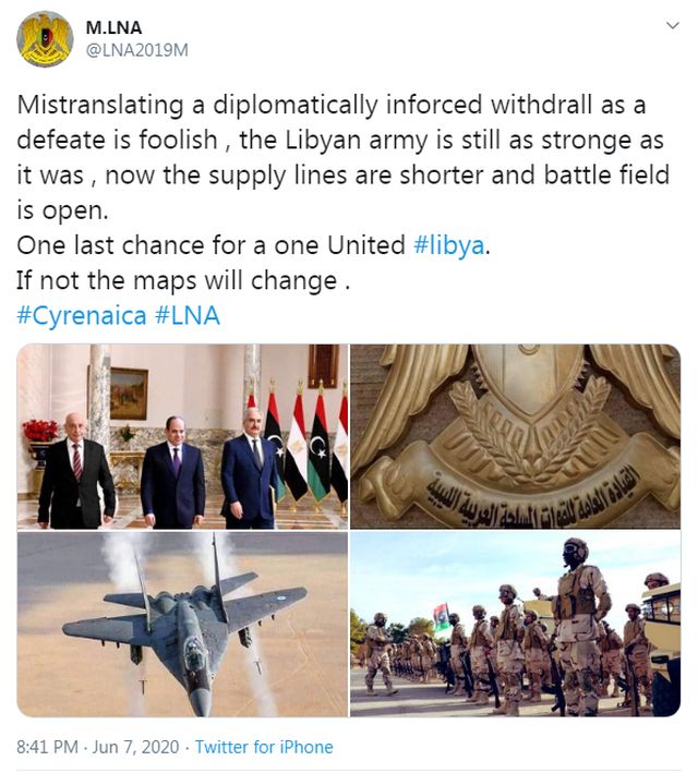 «Η λανθασμένη μετάφραση μιας διπλωματικά αναγκαστικής αποχώρησης ως ήττα είναι ανόητη, ο Λιβυκός Στρατός είναι ακόμα τόσο ισχυρός όσο ήταν, τώρα οι γραμμές εφοδιασμού είναι μικρότερες και το πεδίο μάχης είναι ανοιχτό», γράφει ο ανεπίσημος λογαριασμός του Λιβυκού Εθνικού Στρατού (LNA), του στρατάρχη Χαλίφα Χαφτάρ και συνεχίζει: