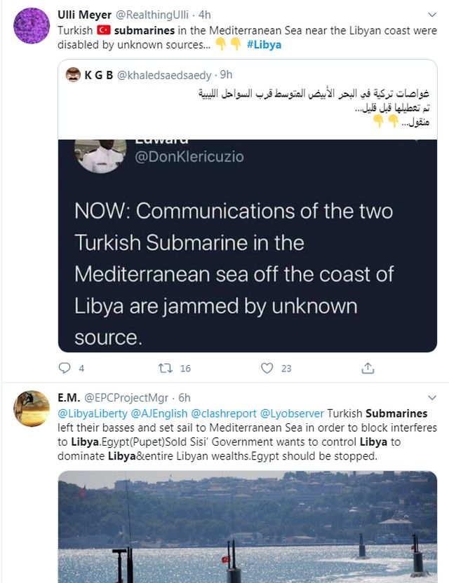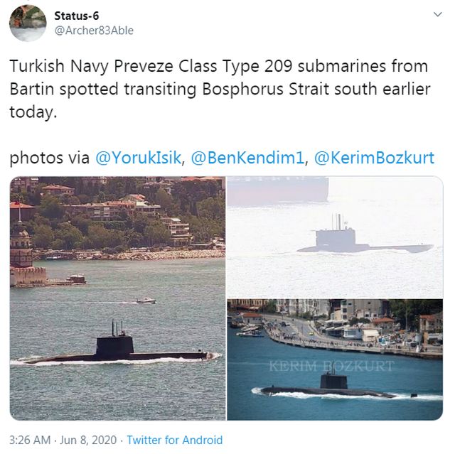Σύμφωνα με τα όσα γράφονται στο Twitter, τα τουρκικά υποβρύχια φέρονται να κατευθύνονται προς τις ακτές της Λιβύης, μια κίνηση που ερμηνεύεται ως απάντηση στη συγκέντρωση αιγυπτιακών τανκς στα σύνορα με τη Λιβύη, ωστόσο, δεν λείπουν και οι άλλοι που αφήνουν «ανοιχτό» το ενδεχόμενο να μην είναι αυτή η μοναδική αποστολή τους.