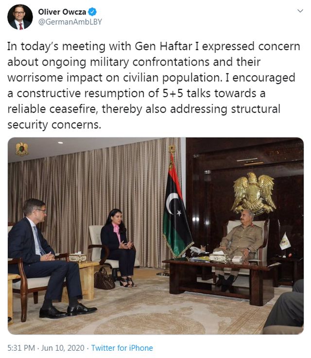 Έτσι, σήμερα Τετάρτη, ο Γερμανός πρεσβευτής στη Λιβύη, Oliver Owcza, συναντήθηκε με τον στρατάρχη Χαφτάρ στη Βεγγάζη.