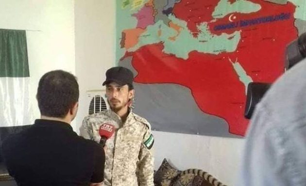 Πρωτοπαλίκαρο των φιλότουρκων Σύρων, των ίδιων που στρατολογούν μισθοφόρους για να τους μεταφέρει ο Ερντογάν στη Λιβύη, να υπερασπιστούν την ισλαμική κυβέρνηση της Τρίπολης, κάνει δηλώσεις μπροστά στον χάρτη του χαλιφάτου, της Οθωμανικής Αυτοκρατορίας, ενώ φέρει στο μπράτσο τα διακριτικά (σημαία) του Ελεύθερου Συριακού Στρατού (FSA) και ίδια σημαία μεγάλων διαστάσεων είναι κρεμασμένη και στον τοίχο αριστερά πίσω του.