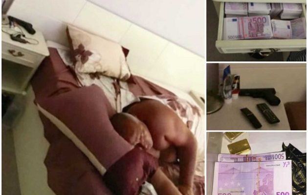 Άλλες φωτογραφίες δείχνουν ένα πιστόλι πάνω στο κομοδίνο δίπλα στο κρεβάτι και δέσμες χαρτονομισμάτων των 500 ευρώ και ράβδους χρυσού μέσα στο ανοιχτό συρτάρι του κομοδίνου.