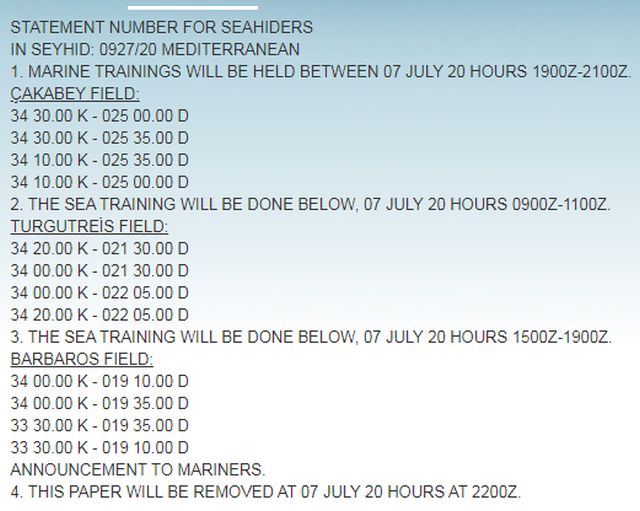 Το τουρκικό Πολεμικό Ναυτικό εξέδωσε NAVTEX για μια αεροναυτική άσκηση μεταξύ Λιβύης και Κρήτης. Οι Τούρκοι ονόμασαν τις τρεις θαλάσσιες περιοχές που διεξάγουν την άσκηση «Μπαρμπαρός» (Barbaros), «Τουργκούτ Ρέις» (Turgut Reis) και «Τζάκα Μπέη» (Çaka Bey).