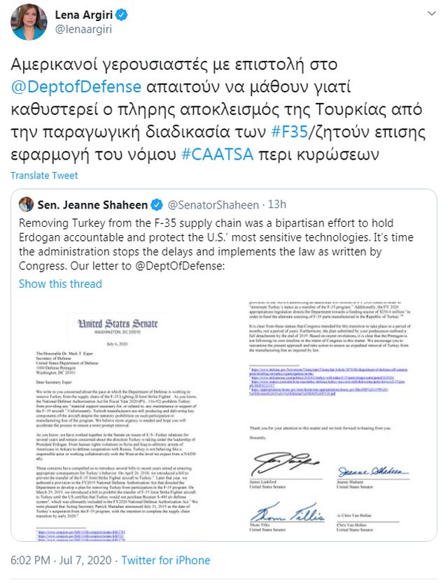 Σε επιστολή που έστειλαν στον υπουργό Άμυνας Μαρκ Έσπερ τη Δευτέρα, οι νομοθέτες προειδοποίησαν το Πεντάγωνο λέγοντας ότι τυχόν σχέδια για αγορά εξαρτημάτων για τα F-35 από τουρκικές εταιρείες υπονομεύουν τις πιέσεις που ασκούν οι Ηνωμένες Πολιτείες στην Τουρκία για την αγορά (και παραλαβή) του ρωσικού αμυντικού συστήματος S-400.