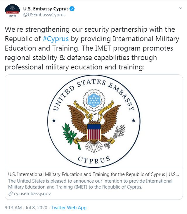 Τη συμμετοχή της Κυπριακής Δημοκρατίας στο πρόγραμμα Διεθνούς Στρατιωτικής Εκπαίδευσης και Κατάρτισης (ΙΜΕΤ – International Military Education and Training) ανακοίνωσε η Αμερικανική Πρεσβεία στην Κύπρο.