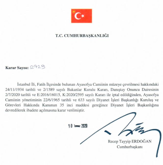 Ο πρόεδρος Ερντογάν υπέγραψε το προεδρικό διάταγμα που μετατρέπει την Αγία Σοφία σε τζαμί και την παρέδωσε στο Ίδρυμα Ντιγιανέτ, την Υπηρεσία Θρησκευτικών Υποθέσεων της Τουρκίας.