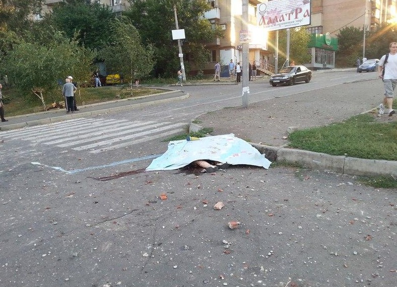 Ήταν ορατές τρύπες από θραύσματα σε τοίχους. Κάτοικοι κάλυψαν τη σορό μιας γυναίκας.